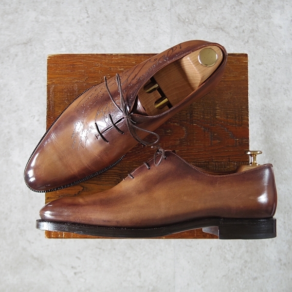 岡山県倉敷市にお住いのお客様より、ベルルッティのアレッサンドロをお買い取りさせて頂きました。 2015年にベルルッティが120周年を迎えた際に展開されていた記念モデルとなり、右足にはカリグラフィー、左のアウトソールには120 anniversaryの刻印が入る特別仕様となっておりました。状態に関しては、使用感の薄い大変綺麗な中古状態。前オーナー様は高級靴をたくさんお持ちでしたが、ベルルッティはあまり履かれてなかったとの事で他にも数足綺麗な状態の製品をお譲りくださりました。買取金額は¥76,000-(本体のみの査定額)となりました。人気モデルのカリグラフィー仕様の製品でしたので、同ブランドでは上位の査定結果となります。
