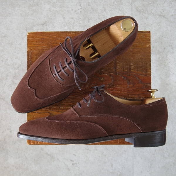 内羽根ブラインドブローグのモデルWOODCOTE、プレステージラインのお品物です。今回の仕様としては濃茶のスエード素材、状態としては外で一切履かれていない未使用状態となりました。